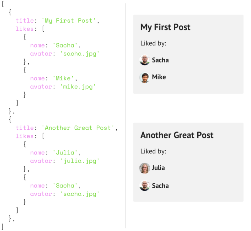 举个栗子,假设你需要展示帖子列表,每个帖子下面展示一个带有用户名和头像的点赞列表。很简单,调整 API,加入一个点赞用户数组: